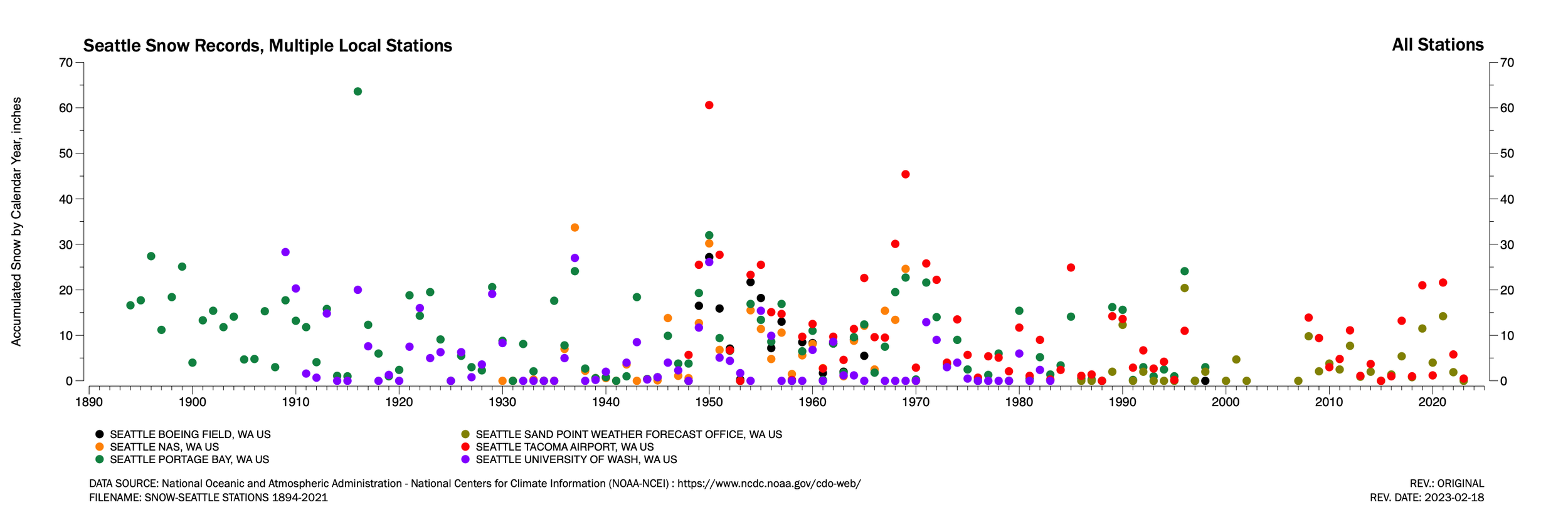 I put together several charts to see if any patterns or trends over time could be detected. Frankly, I don’t see many from this broad (and quick) overview. In fact, I was surprised how uniform the data looked whether years were grouped across decades or individual snow events were plotted across time.